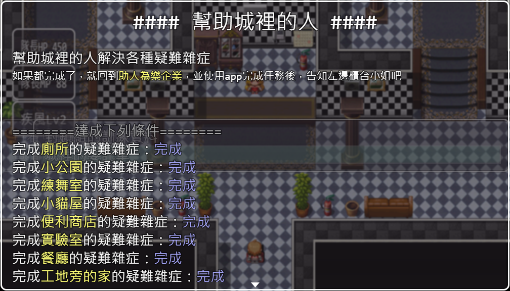 難度由玩家自行決定,若擋NPC的隊友不夠多,可以於大樓1F右上側睡覺補MP。