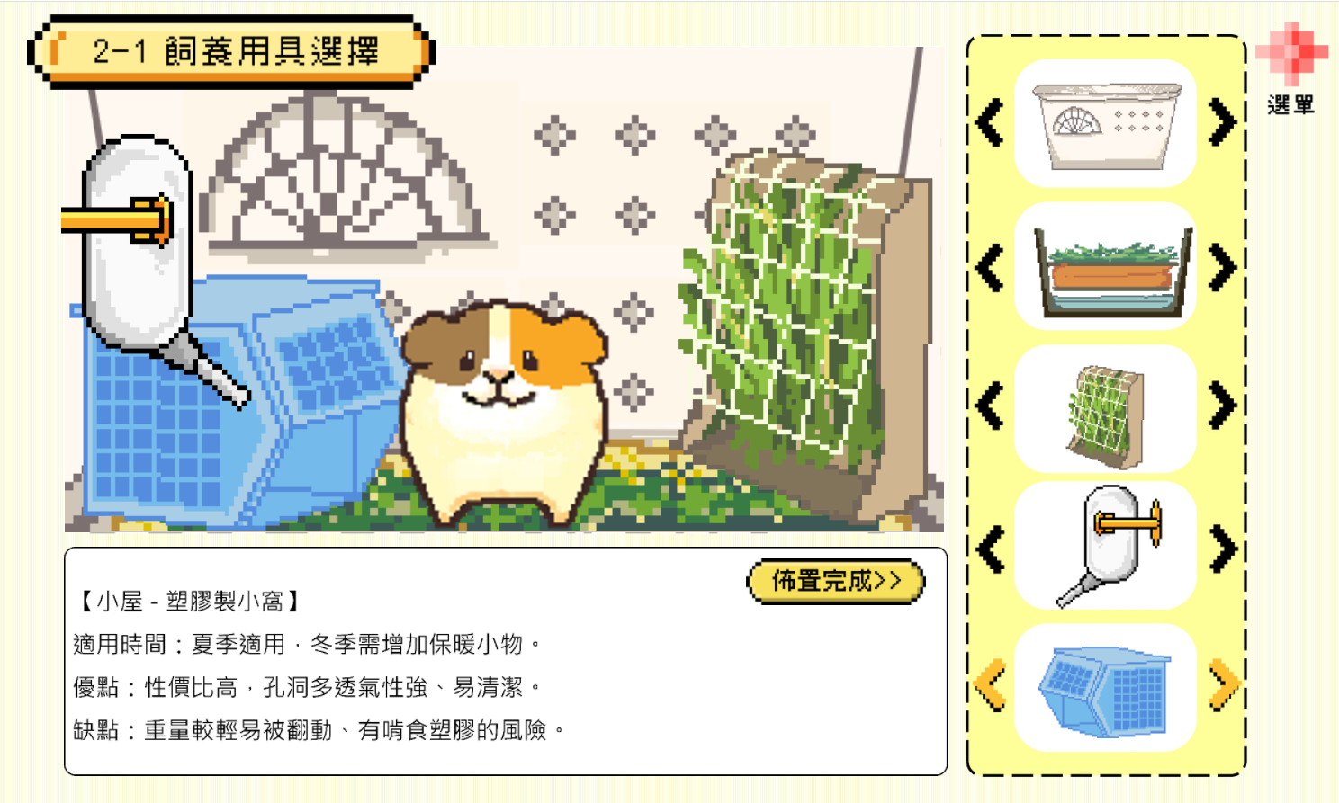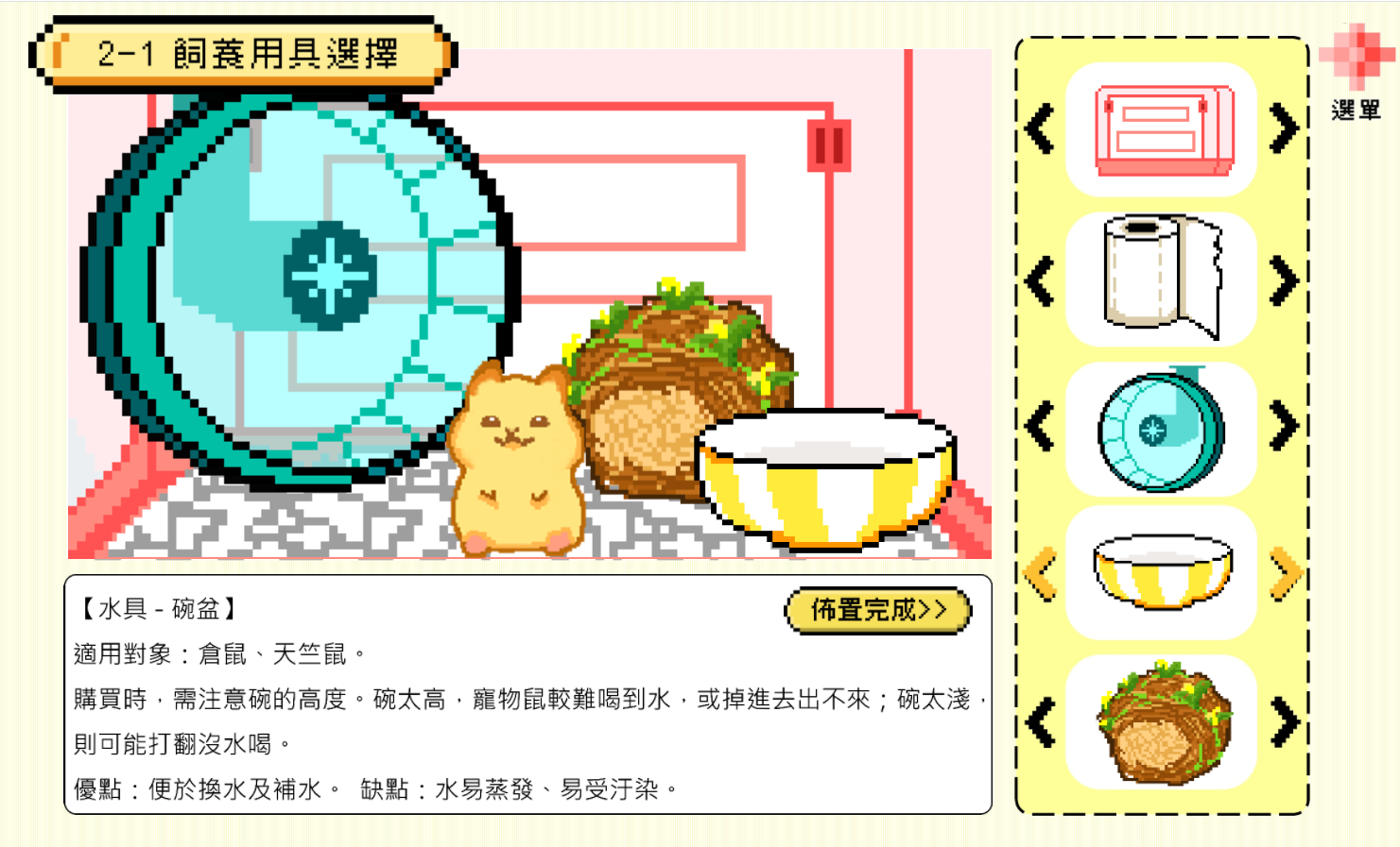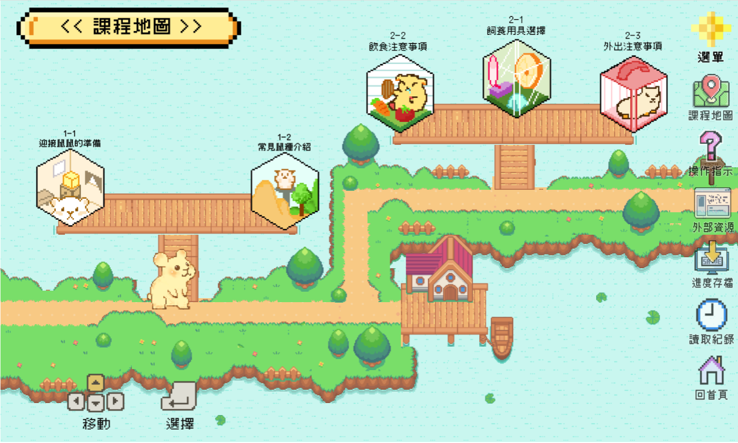 教學內容單元包含了寵物鼠飼養前的準備與觀念宣導、常見鼠種介紹、環境設置與飲食注意事項、陪伴互動與健康照顧等等。此外更採用了多樣化的遊戲與情境影片來進行教學,學習過程生動有趣、存讀檔功能更讓學習進度不丟失!